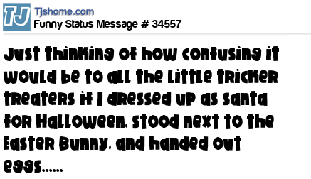 - # 77531 Just thinking of how confusing it would be to all the little tricker treaters if I dressed up as santa for Halloween and handed out candy.....