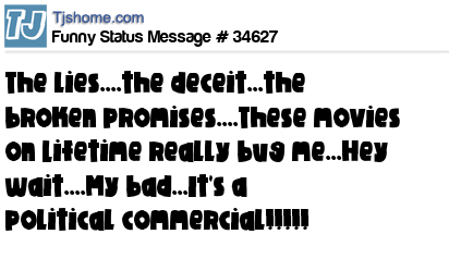 X  The lies....the deceit...the broken promises....These movies on Lifetime really bug me...Hey wait....My bad...It's a political commercial!!!!!