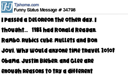 X says I passed a Deloreon the other day. I thought... 1985 had Ronald Reagan, Rambo, rubics cube, mullets and Bon Jovi. Why would anyone time travel 2010? Obama, Justin Bieber, and Glee are enough reasons to try a different decade.