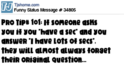 - # 29502 Pro Tip: If someone asks you if you "have a sec" and you answer "I have lots of secs", they will forget their original question.