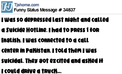 X I was so depressed last night and called a Suicide Hotline. I had to press 1 for English. I was connected to a call center in Pakistan. I told them I was suicidal. They got excited and asked if I could drive a truck….