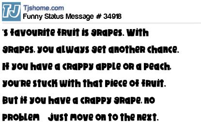 X 's favourite fruit is grapes. With grapes, you always get another chance. If you have a crappy apple or a peach, you're stuck with that piece of fruit. But if you have a crappy grape, no problem – just move on to the next. Grapes: The Fruit of Hope.