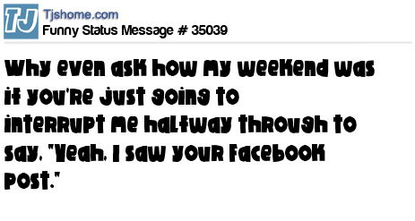 - # 63198 Why even ask how my weekend was if youre just going to interrupt me halfway through to say Yeah, I saw your Facebook post.