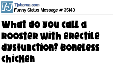 X What do you call a rooster with erectile dysfunction? Boneless chicken