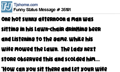 X One hot sunny afternoon a man was sitting in his lawn-chair drinking beer and listening to the game, while his wife mowed the lawn. The Lady next store observed this and scolded him.... "How can you sit there and let your wife do the hard work? Any man w