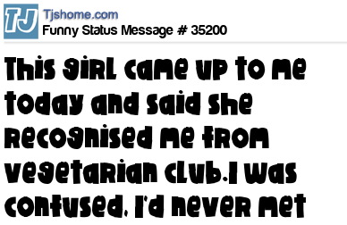 - # 80499 This girl came up to me today and said she recognized me from the Vegetarian Club. I was a bit confused, seeing how I'd never met herbivore.