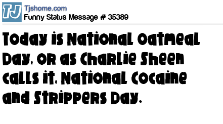 X Today is National Oatmeal Day, or as Charlie Sheen calls it, National Cocaine and Strippers Day.