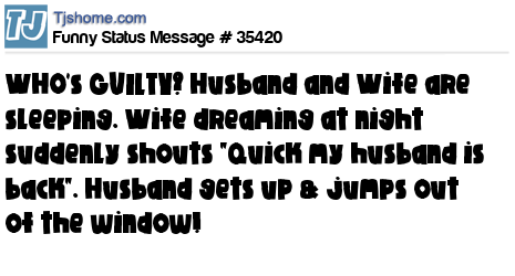 - # 17344 WHO's GUILTY?Husband n Wife r sleeping. Wife dreamin at nite suddenly shouts "Quick my husband is back". Husband gets up & jumps out of d window!