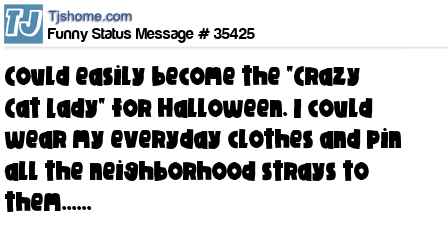 X says could easily become the "Crazy Cat Lady" for Halloween. I could wear my everyday clothes and pin all the neighborhood strays to them......
