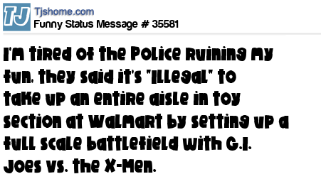 X I'm tired of the Police ruining my fun, they said it's "Illegal" to take up an entire aisle in toy section at Walmart by setting up a full scale battlefield with G.I. Joes vs. the X-Men.