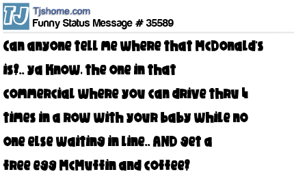 X can anyone tell me where that McDonald's is?.. ya know, the one in that commercial where you can drive thru 4 times in a row with your baby while no one else waiting in line.. AND get a free egg McMuffin and coffee?