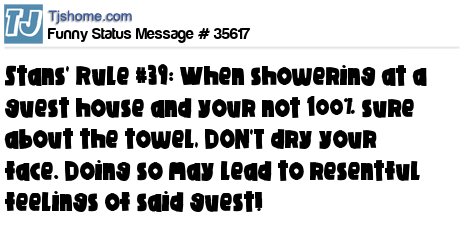 X Stans' Rule #39: When showering at a guest house and your not 100% sure about the towel, DON'T dry your face. Doing so may lead to resentful feelings of said guest!
