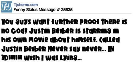 X You guys want further proof there is no God? Justin Beiber is starring in his own movie about himself. Called Justin Beiber Never say never... IN 3D!!!!!! wish I was lying...