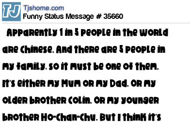 - # 32945 Apparently, 1 in 5 people in the world are Chinese. And there are 5 people in my family, so it must be one of them. It's either my mum or my dad. Or my older brother Colin. Or my younger brother Ho-Chan-Chu. But I think it's Colin.