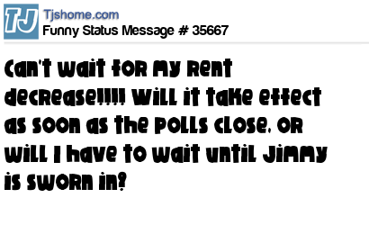 X says Can't wait for my rent decrease!!!! Will it take effect as soon as the polls close, or will I have to wait until Jimmy is sworn in?