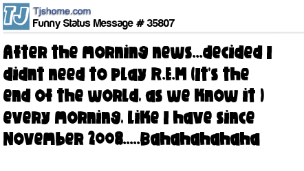 X says After the morning news...decided I didnt need to play R.E.M (It's the end of the world, as we know it ) every morning, like I have since November 2008.....Bahahahahaha