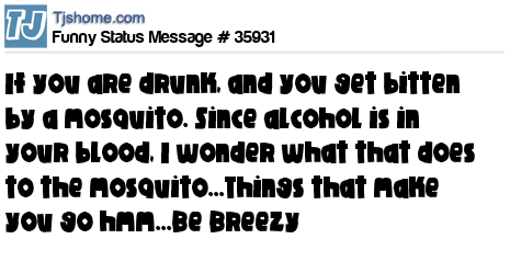 X says If you are drunk, and you get bitten by a mosquito. Since alcohol is in your blood, I wonder what that does to the mosquito...Things that make you go hmm...Be Breezy