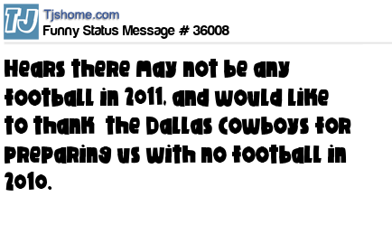 X hears there may not be any football in 2011, and would like to thank the Dallas Cowboys for preparing us with no football in 2010.