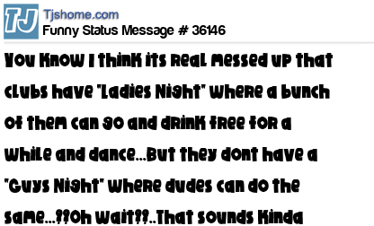 X says You know I think its real messed up that clubs have "Ladies Night" where a bunch of them can go and drink free for a while and dance...But they dont have a "Guys Night" where dudes can do the same...??Oh wait??..That sounds kinda gay...NEVERMIND
