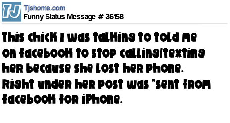 X this chick I was talking to told me on facebook to stop calling/texting her because she lost her phone. Right under her post was "sent from facebook for iPhone.