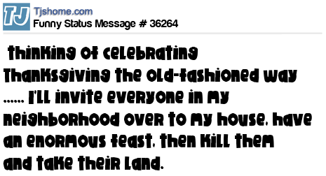 - # 117564 “I celebrated Thanksgiving in an old-fashioned way. I invited everyone in my neighborhood to my house, we had an enormous feast, and then I killed them and took their land.”