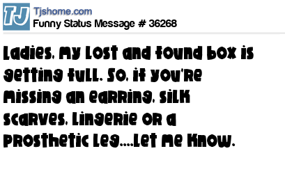 X  Ladies, my lost and found box is getting full. So, if you're missing an earring, silk scarves, lingerie or a prosthetic leg....let me know.