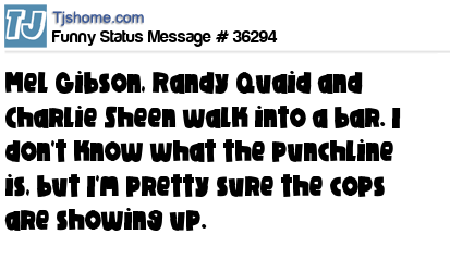 X Mel Gibson, Randy Quaid and Charlie Sheen walk into a bar. I don't know what the punchline is, but I'm pretty sure the cops are showing up.