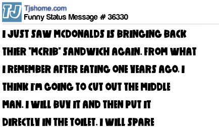 X is I JUST SAW MCDONALDS IS BRINGING BACK THIER "MCRIB" SANDWICH AGAIN. FROM WHAT I REMEMBER AFTER EATING ONE YEARS AGO, I THINK I'm GOING TO CUT OUT THE MIDDLE MAN. I WILL BUY IT AND THEN PUT IT DIRECTLY IN THE TOILET. I WILL SPARE MYSELF THE DISCOMFORT