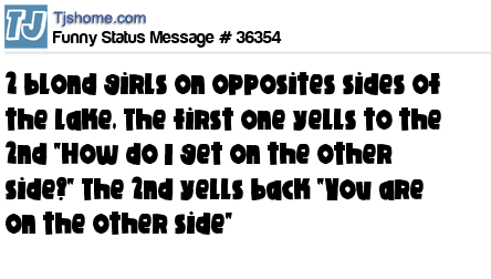 - # 28238 Two blondes are standing on opposite sides of a small lake. One yells to the other: "Hey, how do you get to the other side? The other one yells back: "You're already there!"
