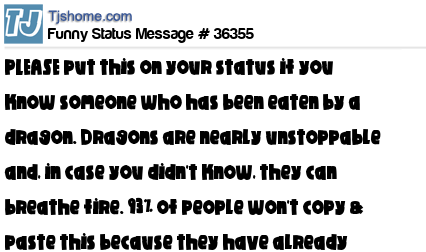 X PLEASE put this on your status if you know someone who has been eaten by a dragon. Dragons are nearly unstoppable and, in case you didn't know, they can breathe fire. 93% of people won't copy & paste this because they have already been eaten by a dragon..