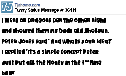 X is I went on Dragons Den the other night and showed them my Dads old Shotgun. Peter Jones said " And whats your idea?" I replied "It's a simple Concept Peter just put all the Money in the f**king bag!"