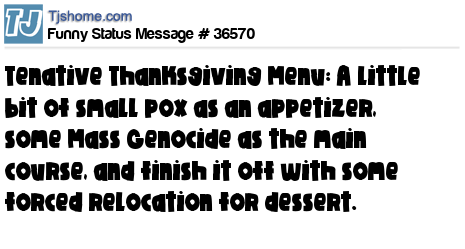 X Tenative Thanksgiving Menu: A little bit of small pox as an appetizer, some Mass Genocide as the main course, and finish it off with some forced relocation for dessert.