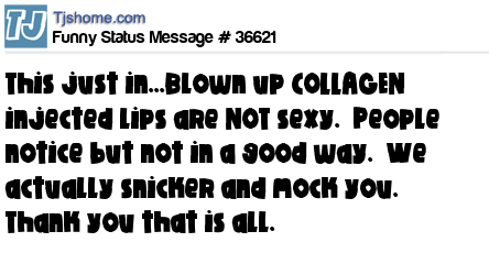 X says This just in...Blown up COLLAGEN injected lips are NOT sexy. People notice but not in a good way. We actually snicker and mock you. Thank you that is all.