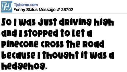- # 20886 so I was just driving high and I stopped to let a pinecone cross the road because I thought it was a hedgehog.
