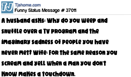 X A husband asks: Why do you weep and snuffle over a TV program and the imaginary sadness of people you have never met? Wife: For the same reason you scream and yell when a man you don't know makes a touchdown.