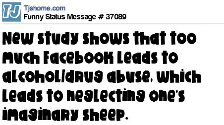 X New study shows that too much Facebook leads to alcohol/drug abuse, which leads to neglecting one's imaginary sheep.