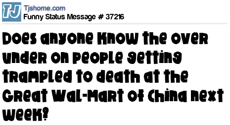 X  Does anyone know the over under on people getting trampled to death at the Great Wal-Mart of China next week?