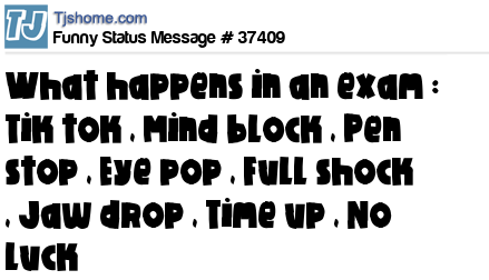 - # 60508 What happens in an exam : Tik tok, Mind block, Pen stop, Eye pop, Full shock, Jaw drop, Time up, No Luck.