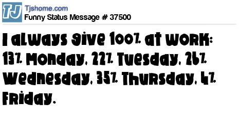 - # 107376 ...“I always give 100% at work: 13% Monday, 22% Tuesday, 26% Wednesday, 35% Thursday, 4% Friday”...