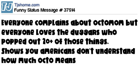 X  Everyone complains about octomom but everyone loves the duggars who popped out 20+ of those things. Shows you americans don't understand how much octo means