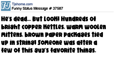 X  He's dead... But look! Hundreds of bright copper kettles, warm woolen mittens, brown paper packages tied up in string! Someone was after a few of this guy's favorite things.