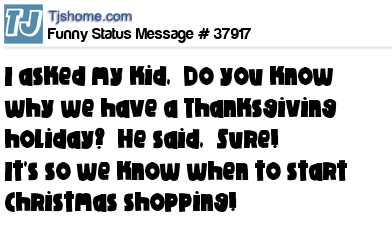 X I asked my kid, “Do you know why we have a Thanksgiving holiday?” He said, “Sure! It's so we know when to start Christmas shopping!”