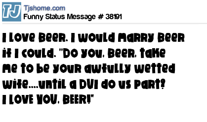 X I love Beer. I would marry Beer if I could. ''Do you, Beer, take me to be your awfully wetted wife....until a DUI do us part? I LOVE YOU, BEER!"