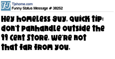 - # 38406 Hey homeless guy, quick tip: don't panhandle outside the 99 Cent Store, we're not that far from you.