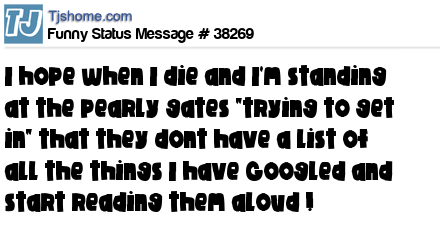 X I hope when I die and I'm standing at the pearly gates "trying to get in" that they dont have a list of all the things I have Googled and start reading them aloud !
