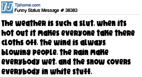 - # 204502 The weather is such a slut. The wind blows everyone, the rain makes everyone wet, the sun makes everyone take their clothes off, and the snow covers everyone in white stuff.