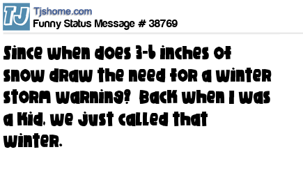 - # 182484 I must be getting old. Since when does 2 to 4 inches of snow become a winter storm warning? Back when I was a kid, we just called flurries, and we complained it wasn't enough to even have a good snowball fight, let along close schools.
