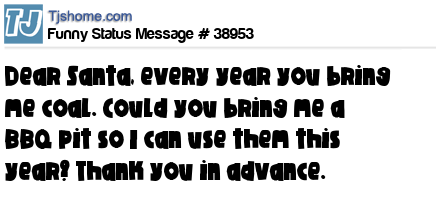 X Dear Santa, every year you bring me coal. Could you bring me a BBQ pit so I can use them this year? Thank you in advance.