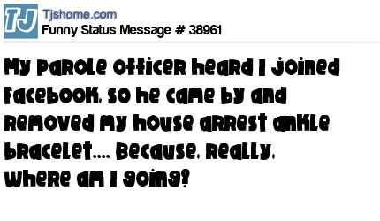 X My parole officer heard I joined Facebook, so he came by and removed my house arrest ankle bracelet.... Because, really, where am I going?