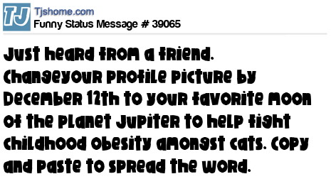 X just heard from a friend. Changeyour profile picture by December 12th to your favorite moon of the planet Jupiter to help fight childhood obesity amongst cats. Copy and paste to spread the word.